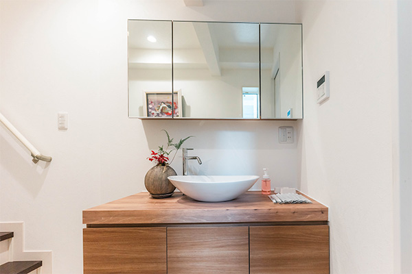 この宿は元々新築で作ったものではなく、リノベーションを加えた施設なのですが、例えばリビングや寝室などの部屋の中は、ある程度色んなアイテムを散りばめて家具や家電で雰囲気を演出することはできるのですが、この宿に関しては廊下部分に洗面スペースを作らないといけませんでした。